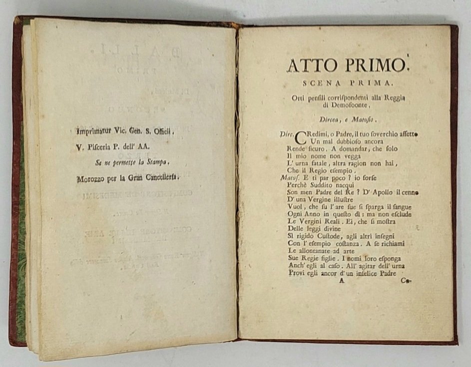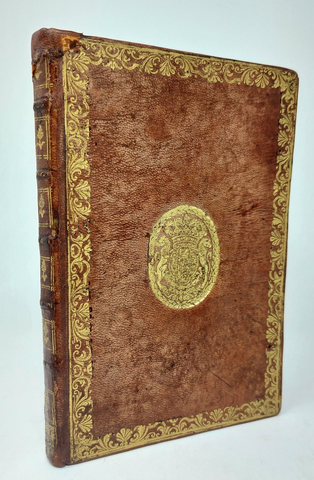 >in-8 (125x190 mm), pp. 63, bellissima legatura coeva in marocchino marrone chiaro, ai piatti larga bordura e rosone centrale con lo stemma araldico di Carlo Emanuele III di Savoia, dorso con filetti e fregi, il tutto impresso in oro (cuffia superiore restaurata, che tocca l'angolo del piatto). Questo libretto d'opera venne rappresentato la prima volta a Vienna nel 1733. Ottimo esemplare in legatura coeva alle armi Sabaude.