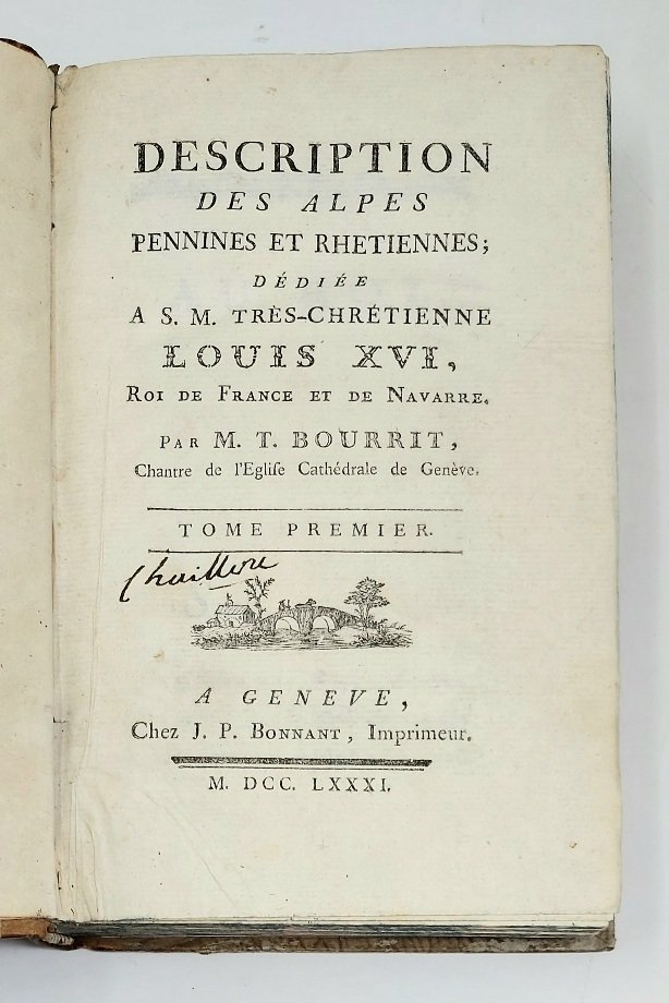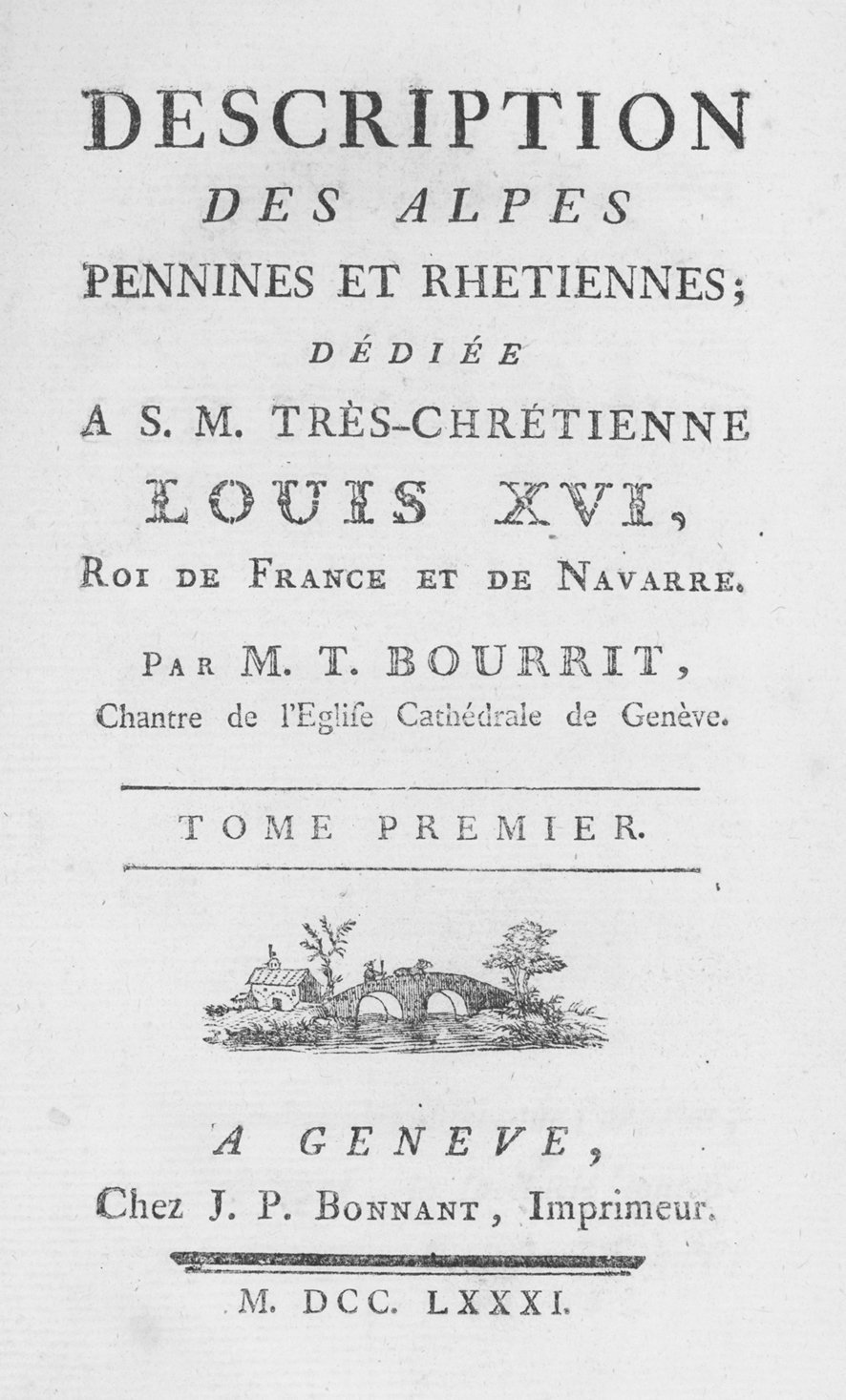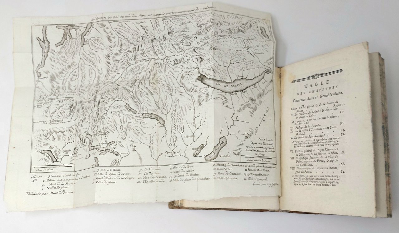 >2 vol. in un tomo in-8 (190x120 mm), pp. XX, 247; (4), 285. Legatura coeva in m. pelle, titolo su tassello in carta al dorso, tagli marmorizzati. Prima edizione di entrambi i volumi, corredati di una carta topogr. più volte ripieg. e 8 tavole f.t. inc. in rame da Angel. Moitte dai disegni dell'autore (Glacier de Chermontane, Vallée de glace de Chermontane, Vue du Vallais et du Rhone, Vallese, Lac du Kandel Steig, Vue du glacier et de la source du Rhône, Glacier du Grindelvald, Vue du lac de Chède et du Mont Blanc); con vignette e finalini in silogr. Dedica al re di Francia Luigi XVI. Opera "qui a contribué de manière décisive au développement de l'intérêt pour les Alpes; Bourrit relate les excursions qu'il a réalisées dans le Valais, où il fut l'un des premiers à explorer les glaciers. Peu courant, très recherché" (Perret). Marc-Théodore Bourrit fu alpinista, compositore, pittore, incisore, viaggiatore, scrittore e storiografo svizzero, ed è considerato a buon diritto, insieme a Horace-Bénédict de Saussure e Jean André Deluc, un pioniere dell'esplorazione delle Alpi e dell'alpinismo. Buon esemplare, fresco e marginoso, alone d'umido al margine interno dei primi fogli del secondo volume. Perret 658.