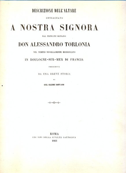 Descrizione dell'altare Consacrato a Nostra Signora nel Tempio novellamente riedificato in Boulogne - Sur - Mer di Francia preceduta da una breve storia di quel celebre Santuario.