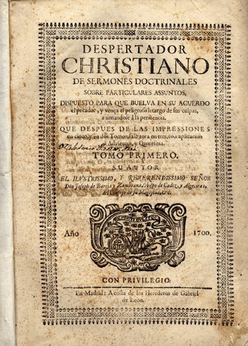 Despertador Christiano de Sermones Doctrinales sobre particulares assuntos. Dispuesto para que buelva en su acuerdo el pecador y vença el peligroso letargo de sus culpas, animándose a la penitencia. Tomo Primero (de tres).