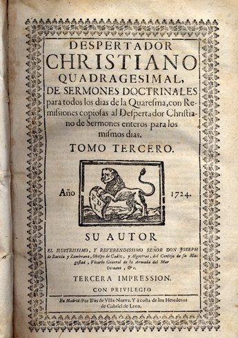 Despertador Christiano Quadragesimal de Sermones Doctrinales para todos los dias de la Quaresma, con remissiones copiosas al Despertador Christiano de Sermones enteros para los mismos dias. Tercera impression. Tomo Tercero (de tres).