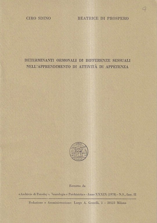 Estratto da 'Archivio di Psicologia Neurologia e Psichiatria', anno XXXIX (1978), N.S., fasc. II - Opuscolo spillato, pag. 183-190, testo in lingua italiana, riassunti in inglese, francese e tedesco / English, French and German summaries. Esemplare in ottime condizioni.