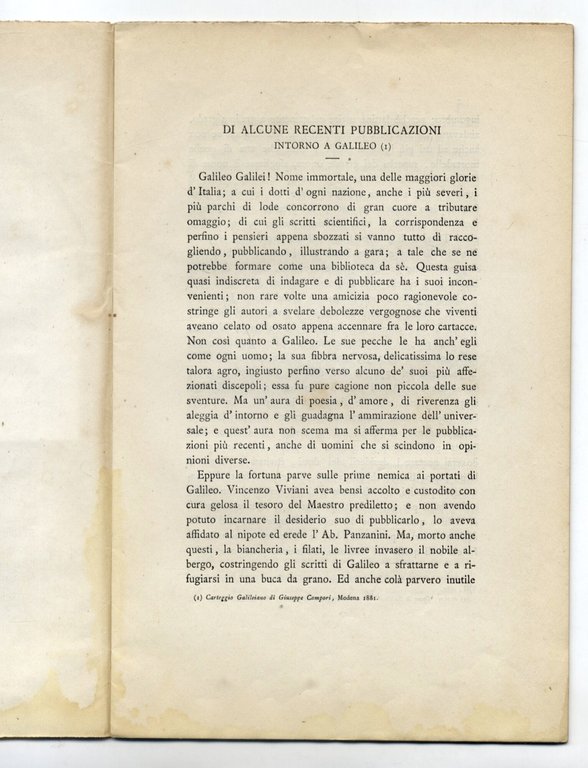>in-8, pp. 25, brossura coeva in carta muta. Prima edizione di questo raro trattatello che prende spunto dalla pubblicazione, proprio nel 1881, del Carteggio Galileiano di Giuseppe Campori, nell'Accademia delle Scienze di Modena. Buon esemplare di illustre provenienza: l'estratto fu infatti inviato dall'Autore al Barone Antonio Manno, Segretario della Deputazione di Storia Patria, come testimoniano la porzione di busta affrancata applicata al contropiatto e la dedica manoscritta al piatto anteriore.