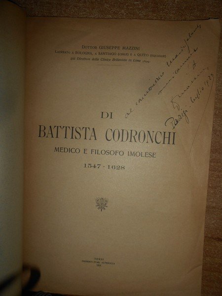 Giuseppe, Mazzini. Terni, Premiati Stab. Alterocca, 1924. Di BATTISTA CODRONCHI Medico e Filosofo Imolese 1547 - 1628. In-8°, br. orig. 26 pp. con alcune illustrazioni nel testo. Opuscolo ben conservato con dedica firmata dall' Autore al frontespizio. Uff. A - II - 3 - 2