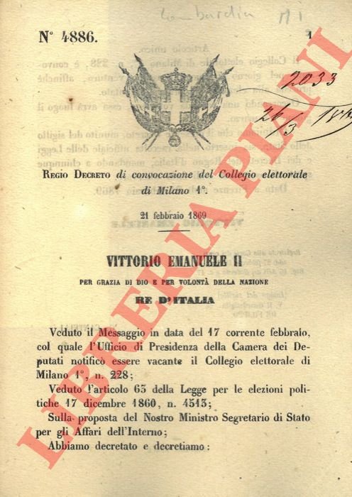Torino, 1869, 21 febbraio, a firma Vittorio Emanuele II, Cantelli, stemma reale xil. pp. 2.