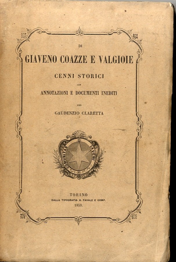 >In-8, pp. XVII, (3), 350, (1) di errata corrige, brochure editoriale a stampa con titolo entro bordura e stemma di Giaveno al piatto superiore. Lievi tracce dl'uso al dorso ma buon esemplare a fogli ancora chiusi. Dedica autografa del Claretta all'occhietto: Al chiarissimo Signor Professor Carlo Faa di Bruno omaggio dell'autore. Prima edizione non comune. Claretta (1835-1900) fu storico di origini torinesi, oltre che Segretario della Regia Deputazione Storica di Torino. Le sue ricerche, sempre meticolose e arricchite da ampia documentazione, si incentrarono per lo più sulla storia del Piemonte e della monarchia sabauda. Brossura con mancanze, ma internamente freschissimo e a fogli chiusi. Manno, VIII, 29681.