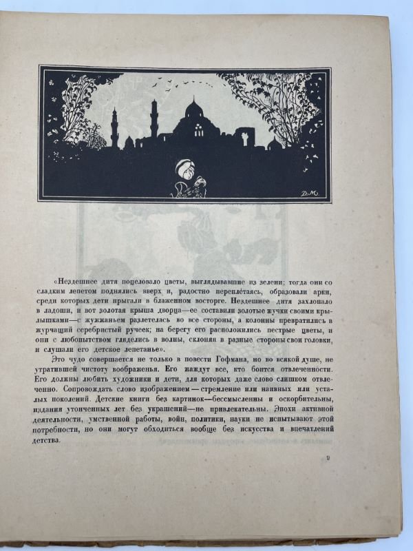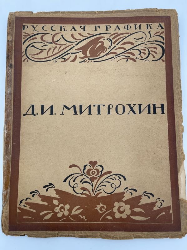 Maison d'édition d'Etat 1922 Moscou, Maison d'édition d'Etat, 1922. In-4 carré broché de 131 pages non coupées très illustrées. Attention, Cet ouvrage est entièrement scotché en dos avec de fort manques. Déchirure en bord de couverture. Mouillure pale en marge supérieure des 4 premiers feuillets (titre, feuillet blanc, frontispice et faux-titre), intérieur en bon état. In-fine, le répertoire bibliographioque de D.I Mitrokhine de 1904 à 1921. Tirage limité à 2000 exemplaires. Bien complet de la vignette en couleurs contrecollée page 21. Edition originale en langue russe, peu courante. En l'état