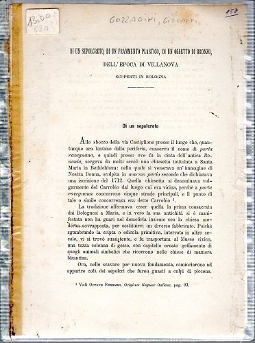 DI UN SEPOLCRETO, di un frammento plastico, di un oggetto di bronzo dell'epoca di Villanova scoperti in Bologna (opuscolo)