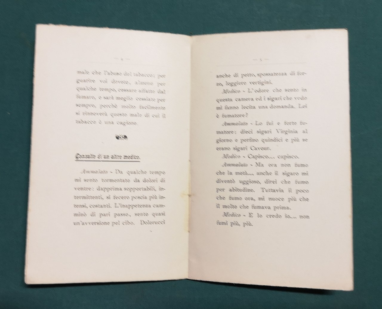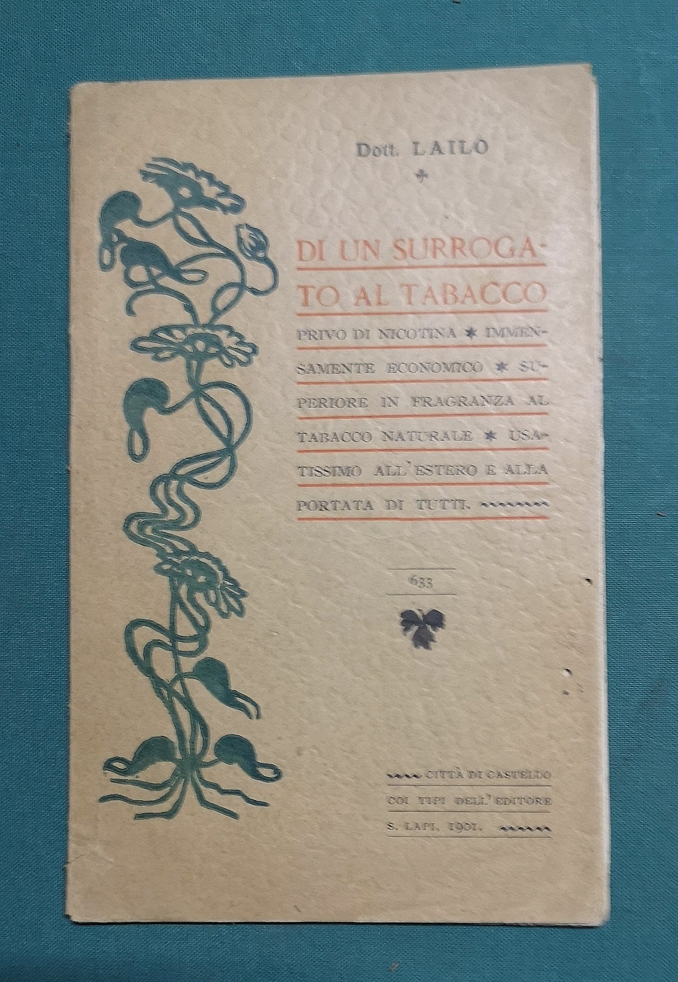 >in-16, pp. 24, broch. edit. figurata a colori. Edizione originale, rarissima, di questo volumetto che, dopo aver introdotto i consulti di medici, chirurghi e oculisti a riprova dell'insalubrità della nicotina, consiglia di sostituire, come si fa altrove e specialmente in Germania, alle foglie di tabacco altre foglie non nocive, come quelle di rapa, di cicoria e di patate. La posizione del Dott. Lailo è che sottoponendo le innocue foglie alle conce tipiche del tabacco, si avrebbero aroma e sapore gustosi al palato quanto quelli del tabacco vero e proprio. Curiosissimo libello, introvabile. Buon esemplare, fresco e marginoso, ma forellini di tarlo al margine esterno della coperta e dei primi ff.