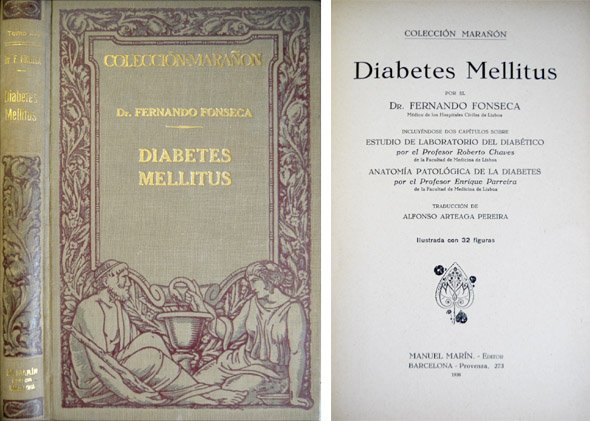 Barcelona, Manuel Marin, Editor, 1930. 4to.; 250 pp. Con 32 ilustraciones entre el texto y un estado plegado aparte. Encuadernación original en tela estampada. Contiene dos capítulos adicionales: "Estudio de laboratorio del Diabético" del Dr. Roberto Chaves y "Anatomía Patológica de la Diabetes", del Dr. Enrique Parreira, ambos profesores de la Universidad de Lisboa.