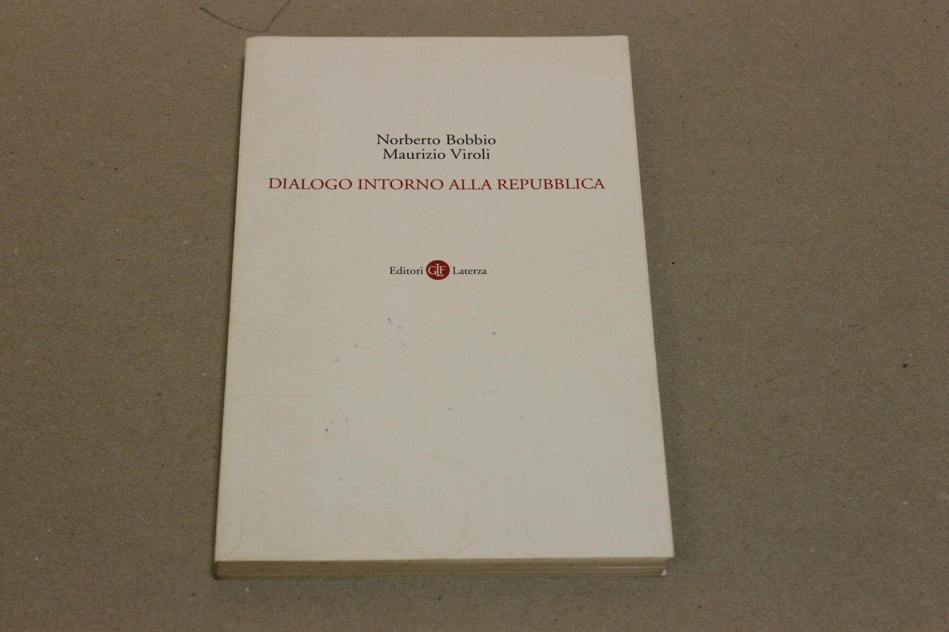 Norberto Bobbio, Maurizio Viroli Dialogo intorno alla Repubblica. Roma-Bari, Edizioni GLF Laterza 2001 italiano, in ottavo pp.121 In forma semplice e profonda i grandi temi della politica e dell'individuo.
