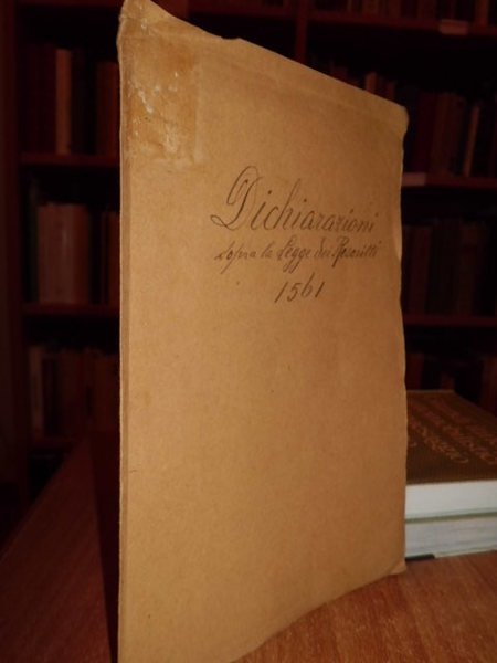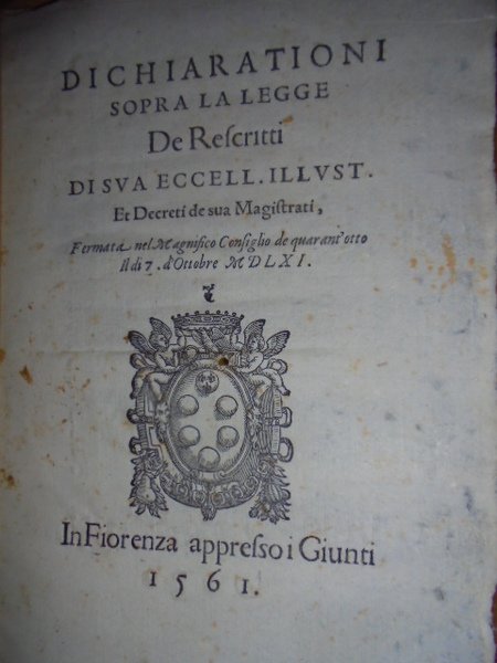 (Firenze) bandi toscani. DICHIARATIONI sopra la legge de Rescritti di Sua Eccell. Illust. et decreti de sua Magistrati. Fermata nel Magnifico Consiglio de quarant'otto il d' 7 d' Ottobre 1561. Fiorenza, appresso i Giunti, 1561. In - 4° antico, cop. muta. (6) pp. Arme ducale nel front. Opuscolo ben con conservato. Pacco opusc. 1 Uff.