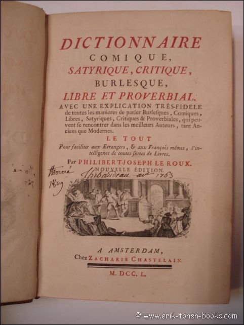Relie de l' epoque, plein maroquin brun, veau marbre, dos orne de fil. fleuronne dore, piece de titre dore, coupes et coiffes dore, 13x20cm, 285pp + 336pp. Dictionnaire comique satyrique, critique, burlesque, libre & proverbial, avec une explication tres-fidele de toutes les manieres de parler burlesques . qui peuvent se rencontrer dans les meilleurs auteurs, tant anciens que modernes.