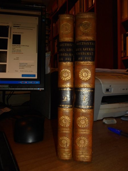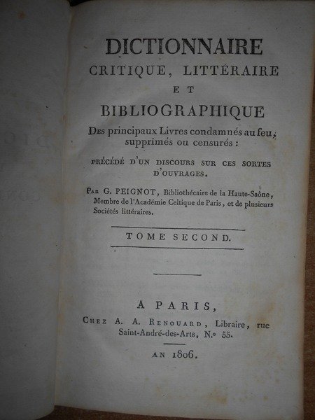 G. Peignot. Paris, Chez A. A. Renouard, An 1806. DICTIONNAIRE critique, littéraire et BIBLIOGRAPHIQUE Des principaux Livres condamnés au feu, supprimés au censurés: précédé d' un discours sur ces sortes d' ouvrages. Edizione originale. 2 tomi in-8° bella legatura coeva in piena pelle con cornici dorate sui piani, fregi e titoli in oro ai dorsi, ex libris K. F. Plesner. I. XV, (i), XL, 343 pp.; II. (iv), 295 pp. Bellissimo esemplare dell' edizione originale. Uff. F - 1