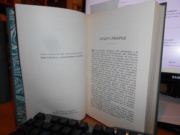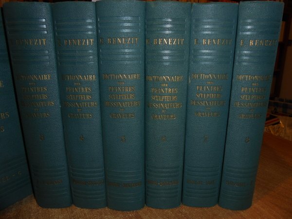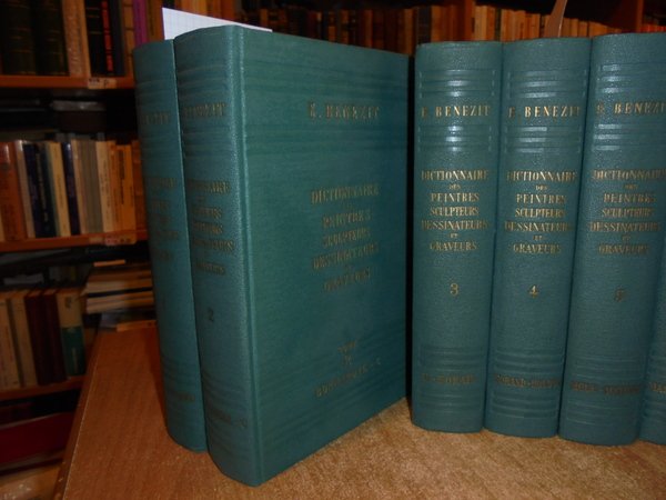 E. Bénézit. France, Librairie Grund, 1948/1949/1955/1956/1957/1958. Dictionnaire des Peintres Sculpteurs Dessinateurs et Graveurs de tous les temps et de tous les pays par un groupe d' écrivains spécialistes français et étrangers. Nouvelle édition entièrement refondue, revue et corrigée sous la direction des héritiers. 8 volumi in-8°, tela edit. con titoli in oro sui piane e nei dorsi. Tome premier. AA.- Bonnard. xv, 769, (1) pp. avec 32 reproductions hors texte en héliogravure.; Tome second. Bonnardel - C. (iii), 765, (1) pp. avec 32 reproductions hors texte en héliogravure.; Tome trosième. D - Forain. 812, (2) pp. avec 32 reproductions hors texte en héliogravure.; Tome quatrième. Forand. - Houdon. 771, (1) pp. avec 32 reproductions hors texte en héliogravure.; Tome cinquième. Houe.-Matisse. 840, (2) pp. avec 32 reproductions hors texte en héliogravure.; Tome sixième. Mato-Poussin. 789, (2) pp. avec 32 reproductions hors texte en héliogravure.; Tome septième. Poute-Sny. 823, (2) pp. avec 32 reproductions hors texte en héliogravure.; Tome huitième. Soane.- Z. 884, (1) pp. avec 32 reproductions hors texte en héliogravure. Perfetto esemplare vendibile solo in Italia. Uff. B - I - 2