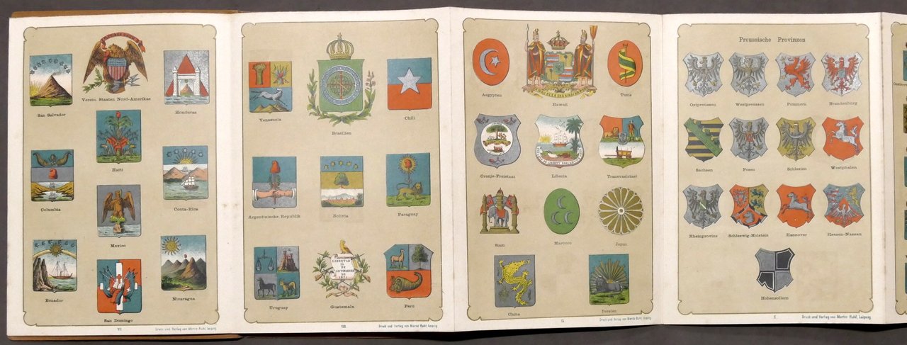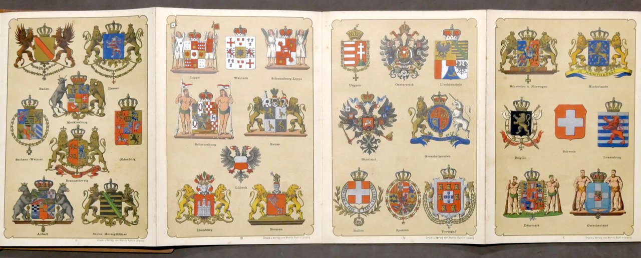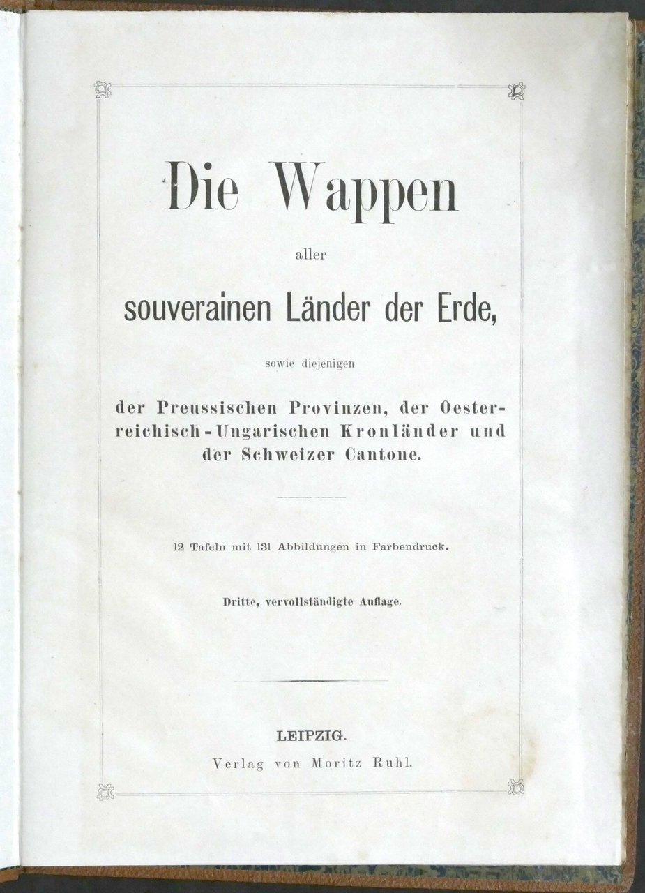 Die Wappen aller souveränen Länder der Erde, sowie diejenigen der Preussischen Provinzen, der Osterreichisch-Ungarischen Kronländer und der Schweizer Cantone (Gli stemmi di tutti i paesi sovrani del mondo, oltre a quelli delle province prussiane, delle terre della corona austro-ungarica e dei cantoni svizzeri) 12 tafeln mit 131 Abbildungen in Farbendruck (12 tavole con 131 illustrazioni a colori) Copertina rigida - Lingua tedesca Condizioni molto buone. Copertina come da foto. Â