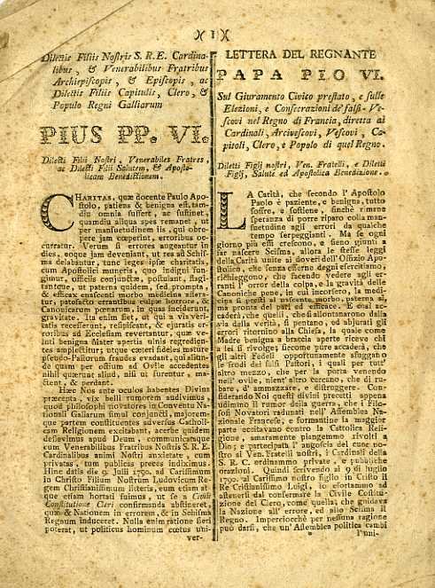 Dilectis filiis nostris S.R.E. cardinalibus, & venerabilibus fratribus archiepiscopis, & episcopis, ac dilectis filiis capitulis, clero, & populo regni Galliarum Pius pp. VI. dilecti filii nostri, venerabiles fratres, ac dilecti filii salutem, & apostolicam benedictionem.