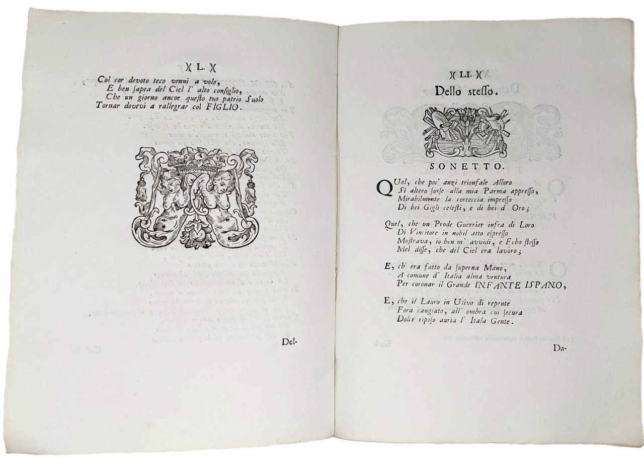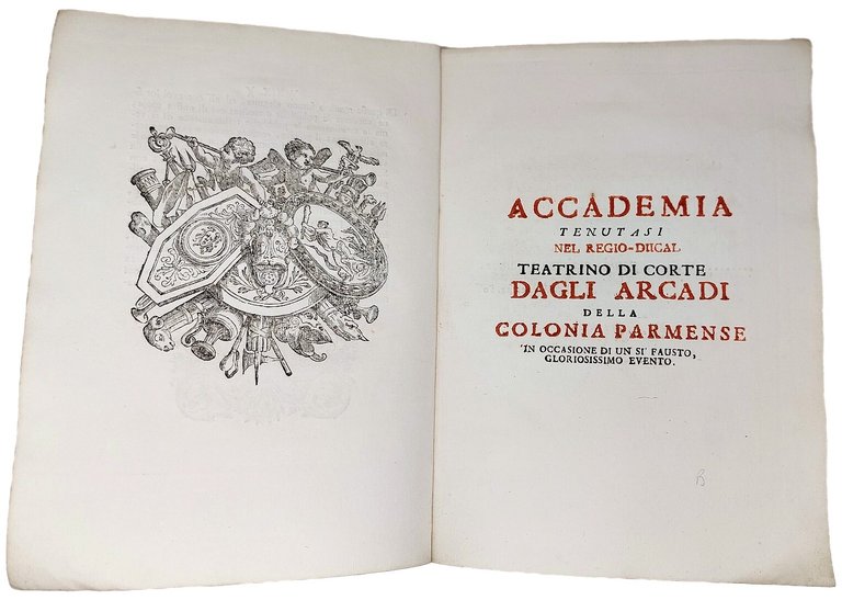 >in-4 (282 x 202 mm), pp. CV (manca ultimo f. bianco), legatura coeva in carta decorata a ramages vegetali rossi su fondo oro. Con una grande tavola ripiegata f.t, raffigurante la grandiosa struttura (disegnata da Mauritius Lotici Parm. Archit.; incisa da Ioseph Patrini Parmen.) eretta in occasione del giuramento a Elisabetta Farnese. Elegante edizione con frontespizio, titoli e sottotitoli n.t. in rosso; elaborate testatine e finalini, in due casi a piena pagina. Le festività vennero indette per manifestare la lealtà della città, dopo la morte del marito Filippo V di Spagna, alla Duchessa Elisabetta Farnese (1692-1766). Seguono una prima sezione in cui vengono descritte gli apparati allegorici allestiti, una serie di versi e prose composti dagli “Arcadi della Colonia parmense” e “Componimenti poetici fatti d'ordine del pubblico”. In fine elenco “De' Signori Arcadi filarmonici...che si distinsero coi loro Suoni nell'Accademia”. Magnifico esemplare. BERLIN 3079. WATANABE 1134. Manca a Ruggieri.