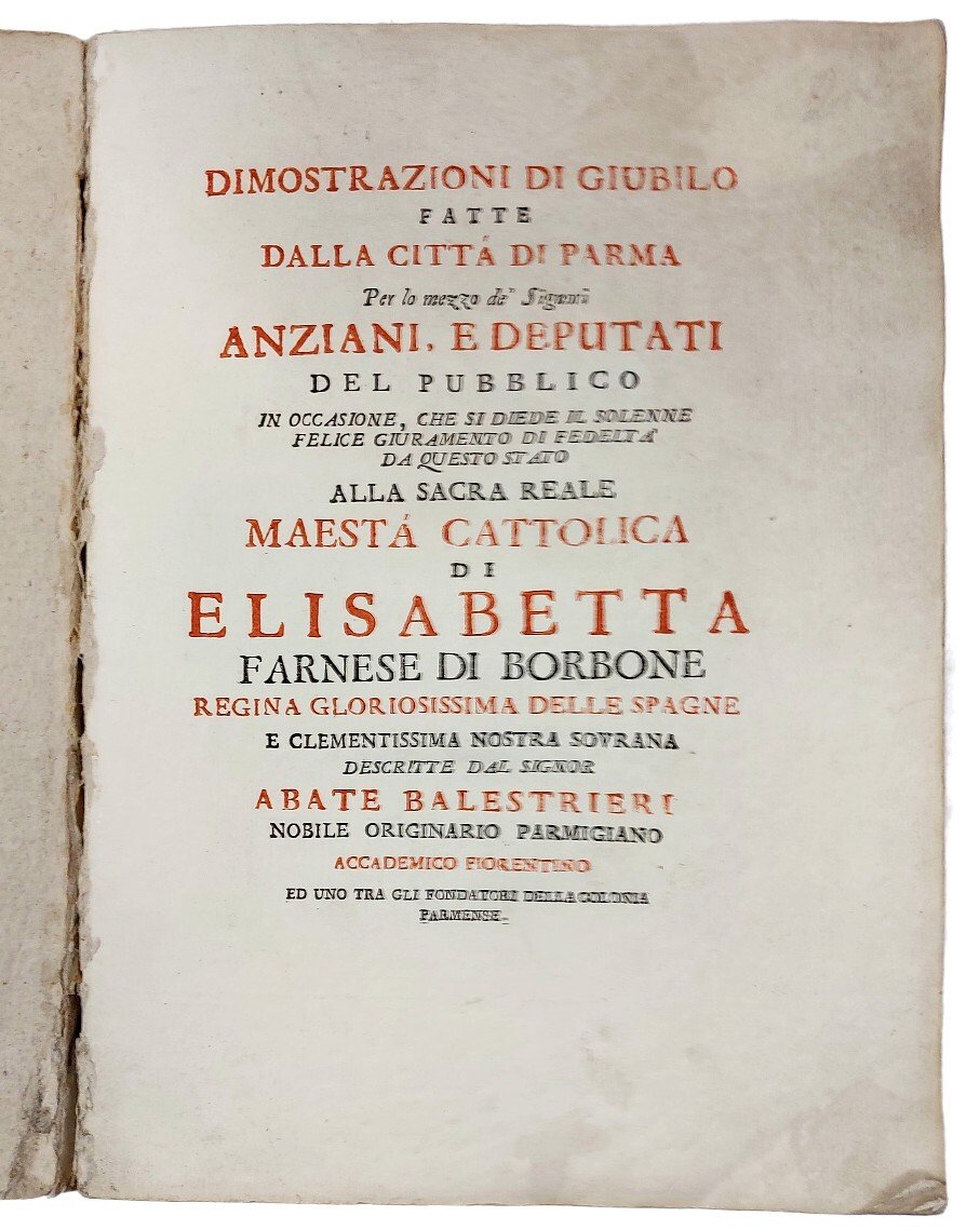 Dimostrazioni di giubilo fatte dalla città di Parma Per lo mezzo de' Signori Anziani, e Deputati del Pubblico in occasione, che si diede il solenne felice giuramento di fedeltà da questo stato alla sacra reale Maestà Cattolica di Elisabetta Farnese di Borbone.