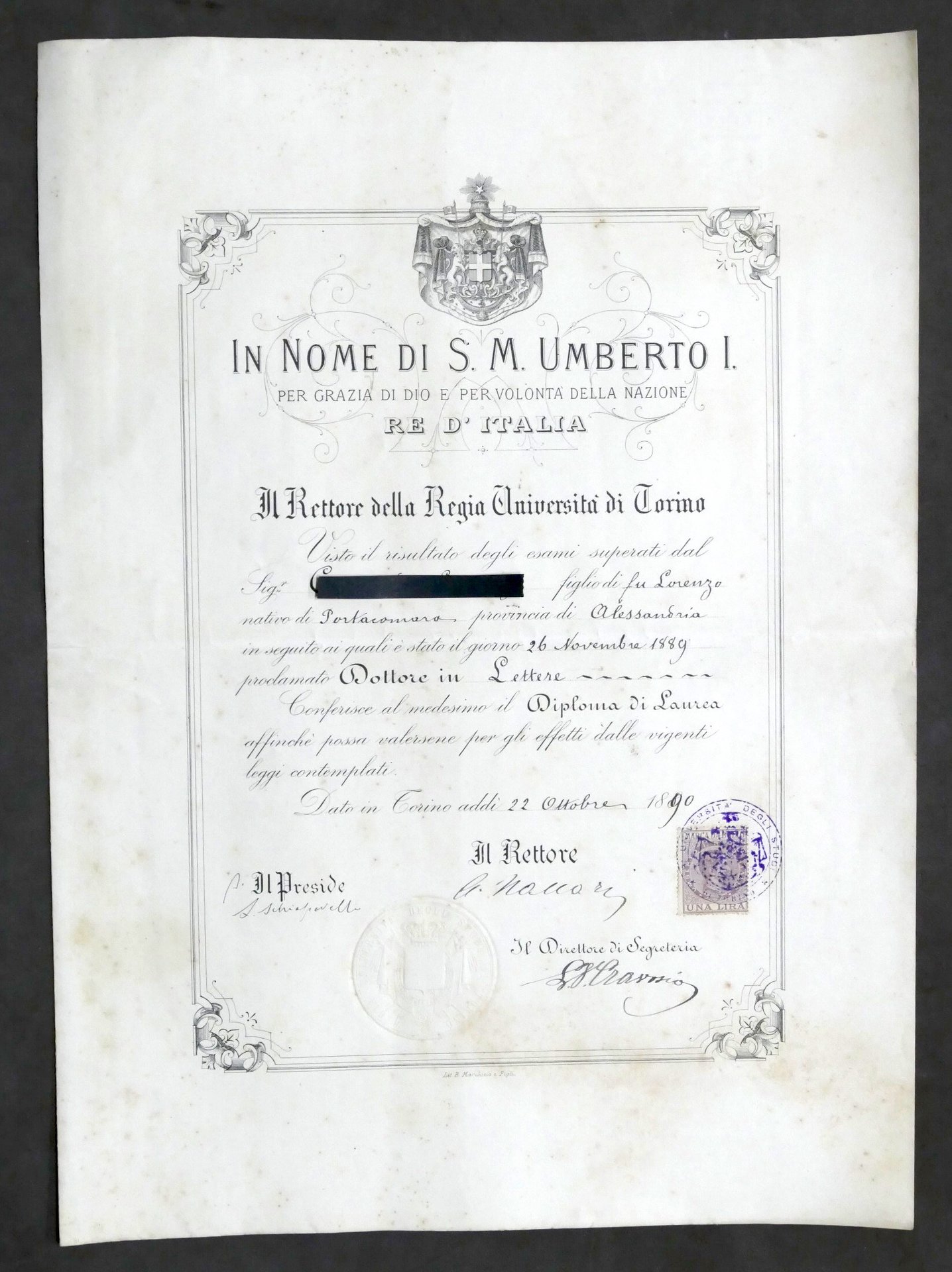 Diploma di Laurea in Lettere - Regia Università di Torino - 1890