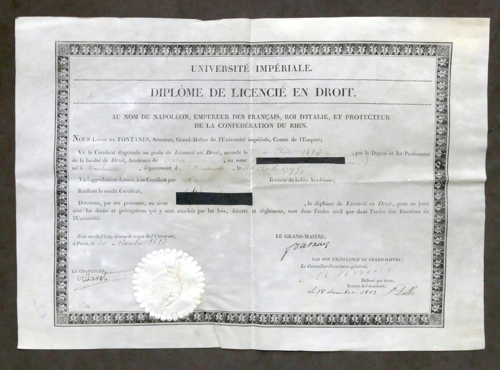 Diplome de Licencié en Droit - Laurea in legge - Università di Parigi - 1813