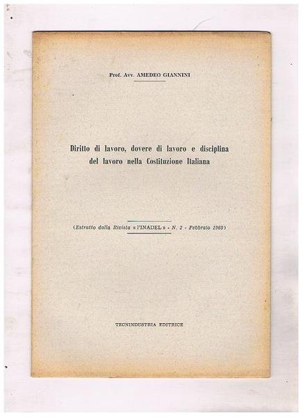 Diritto di lavoro, dovere di lavoro e disciplina del lavoro nella Costituzione Italiana. Estratto dalla Rivista "l'Inadel" n. 2 - febbraio 1960.