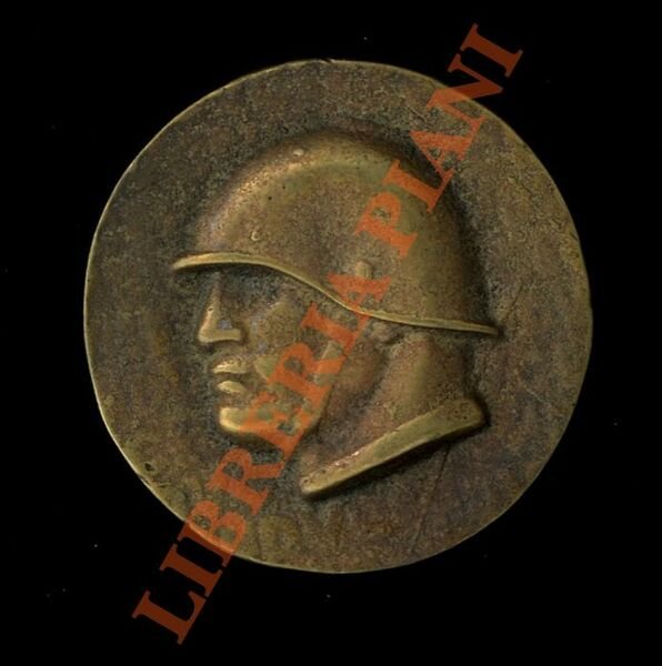 Disco metallico con volto di Mussolini con elmetto