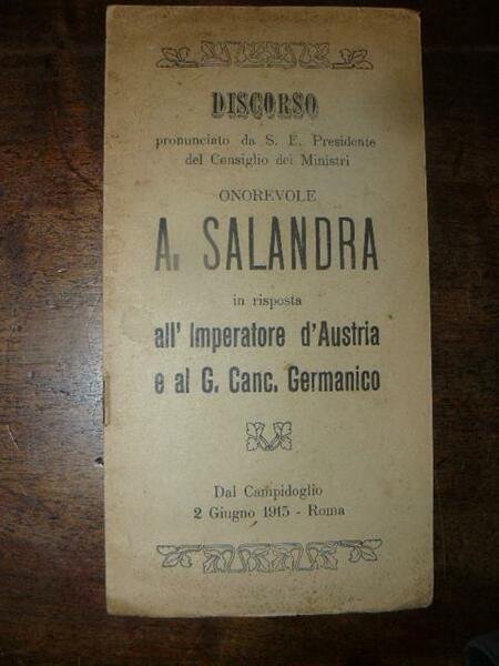 Discorso pronunciato da S. E. Presidente del consiglio dei Ministri onorevole A. Salamandra in risposta all'imperatore d'Austria e al G. Canc. Germanico. Dal Campidoglio 2 giugno 1915