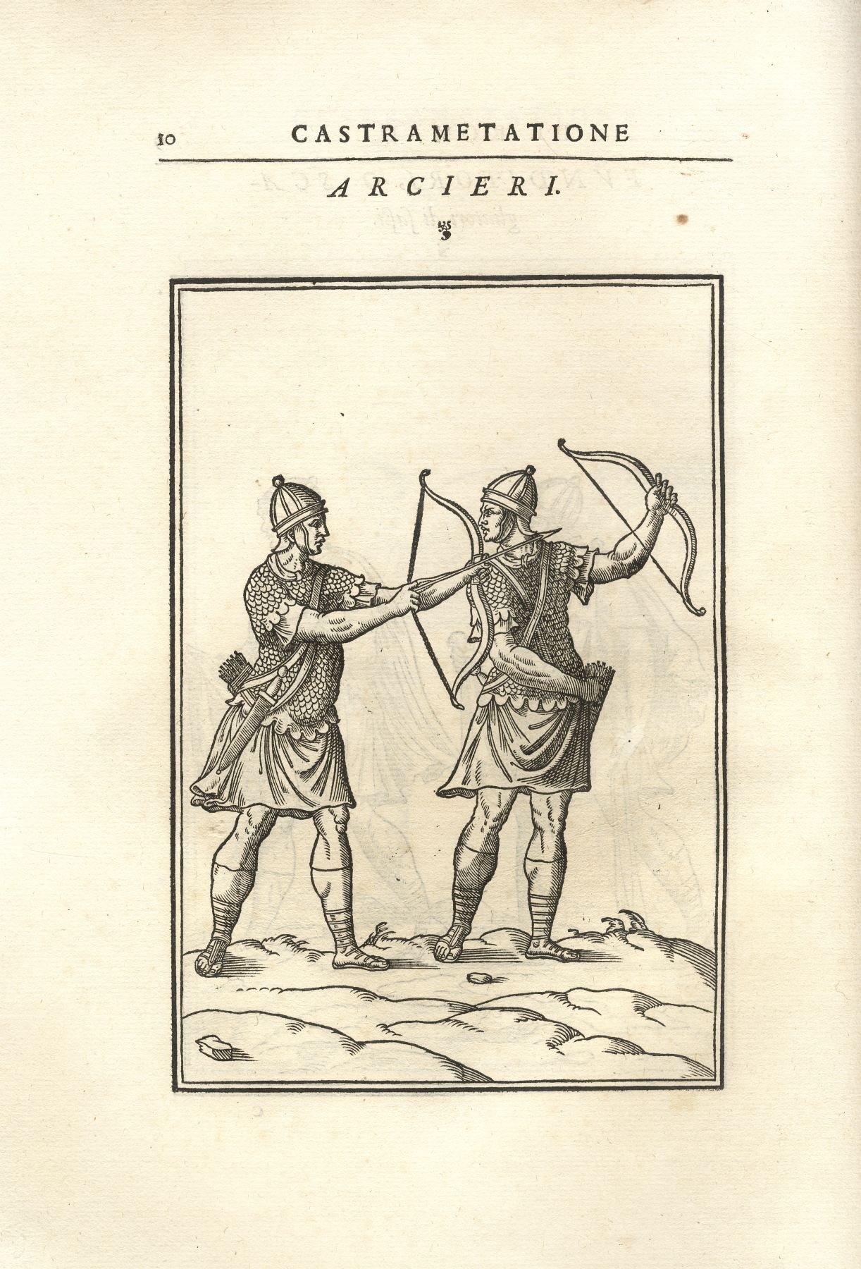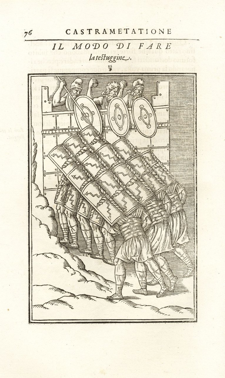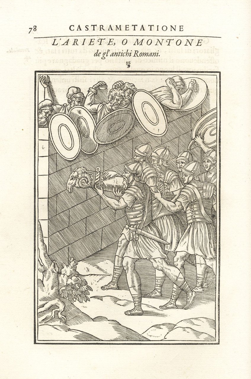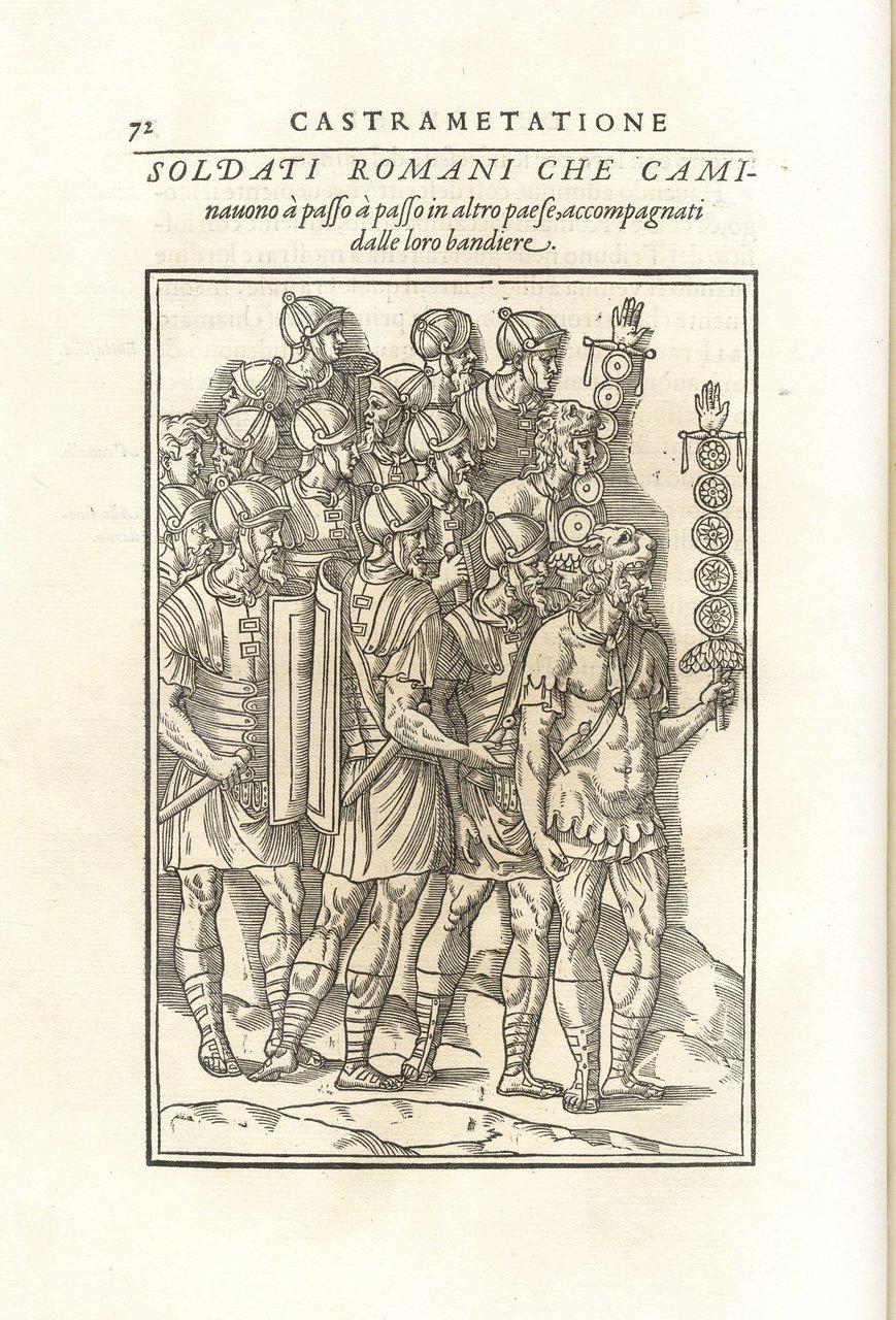 >2 parti in un vol. in-folio (mm 330x245), pp. (8), 103, (2 bb.); 38, (10); legatura coeva piena pergamena molle (restauro alla cuffia superiore e agli spigoli, sguardie rinnovate). Impresa tipografica al titolo, alcune testatine ed alcune bellissime iniziali silogr. Seconda edizione in lingua italiana, in tutto uguale alla prima dell'anno precedente, corredata, per quel che riguarda la “Castramentazione”, di 37 silografie a piena pag. raffiguranti varie tipologie di soldati a piedi ed a cavallo nelle loro uniformi, portatori d'insegne, suonatori, costruzione dell'accampamento, le varie macchine militari, ecc.; i “Bagni” sono illustrati da 3 figure a mezza pag. e 3 a piena pag. raffiguranti l'edificio, i lottatori, oggetti per la cura del corpo (strigilo e gotto). Opera di notevole interesse per la conoscenza dell'arte militare presso i Romani ed i loro usi e costumi nella frequentazione dei bagni pubblici. Esemplare a grandi margini (abilmente rinfrescato, antica firma cancellata al tit., restauro a lavori di tarlo nell'angolo basso dei primi 10 ff.). Ediz. mancante a STC, French. Baudrier IX, 229. Olschki, Choix VII, 10088. Cicognara 3667 (I ediz.): «...bellissime pei tipi e le tavole».
