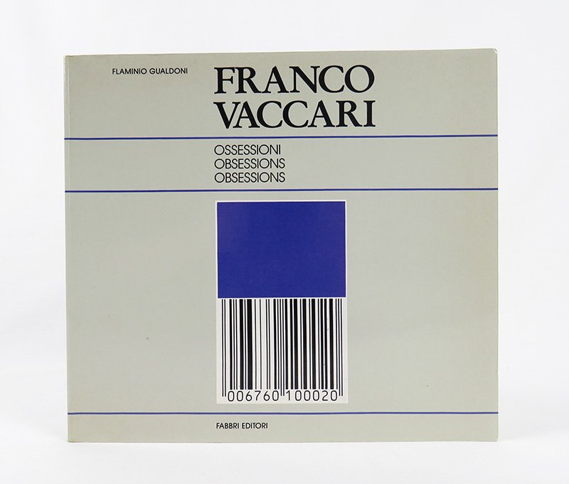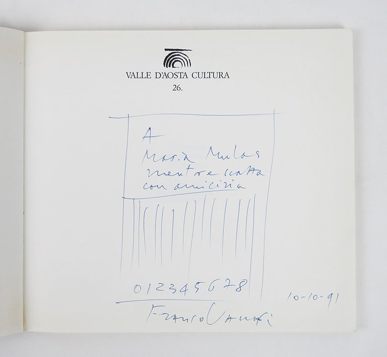 LIBROCatalogo originale.CON AUTOGRAFO.Eccellente esemplare pregiato da una bella dedica con disegno di codice a barre: «A Maria Mulas mentre scatta [disegno] Franco Vaccari 10-10-91»Catalogo dell’importante personale curata da Flaminio Guadaloni a Tour Fromage, Aosta, nel marzo-aprile 1990.