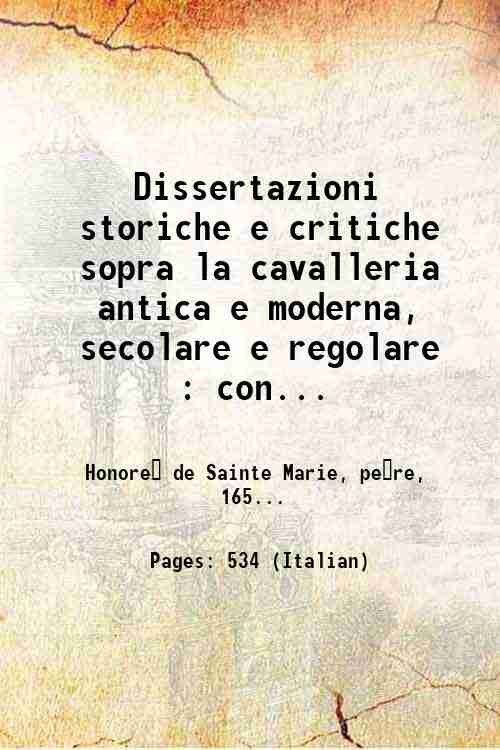 Dissertazioni storiche e critiche sopra la cavalleria antica e moderna, secolare e regolare : con note, e molte figure in rame / di Onorato da Santa Maria, Carmelitano Scalzo Limosino ; da un religioso dello stess' ordine dal franzese tradotte. 1761