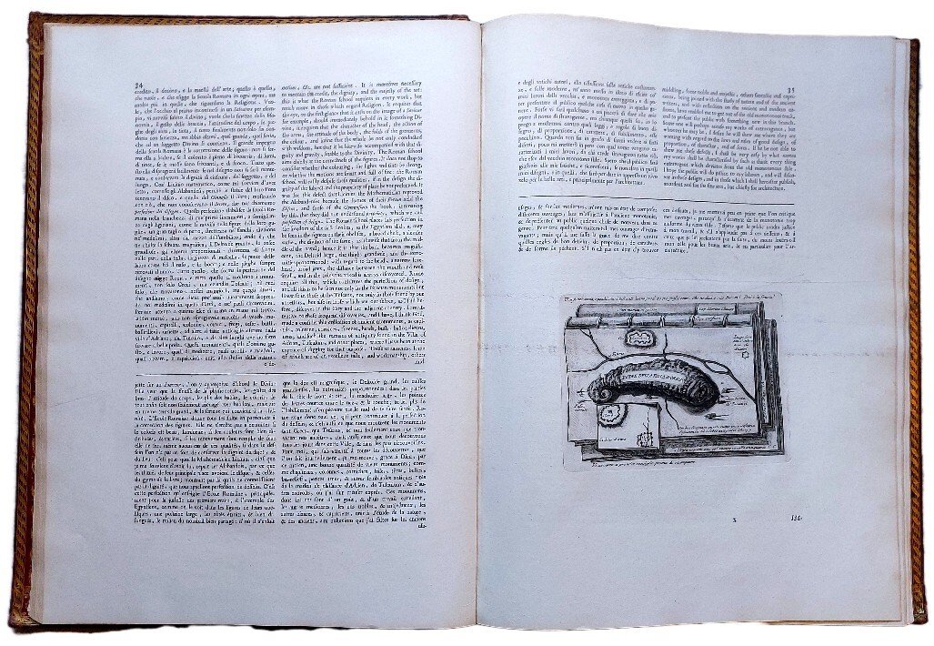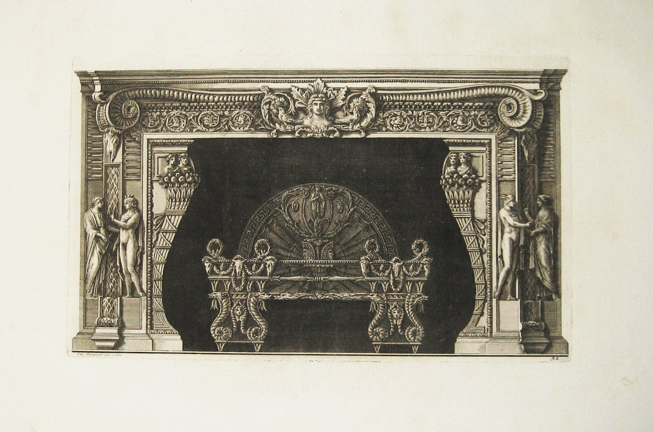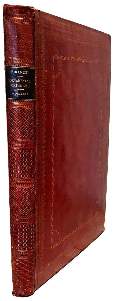 >in-folio gr. (560x425 mm.), titolo a stampa in tre lingue (italiano, inglese e francese), grandioso frontespizio figurato inciso in rame su doppio foglio, con dedica a ''monsignor G.B.Rezzonico Gran Priore in Roma della Sacra Religione Gerosolimitana''. Seguono due pag. di dedica, pp.35 di testo descrittivo nelle tre lingue, 1 foglio finale con Indice delle incisioni: 4 tavole introduttive fuori testo, una testata e un finalino inc., 66 tavole a piena pagina che offrono tutte le eleganti decorazionì scolpite sui camini dell'epoca Egizia, Etrusca e Greca. Complessive 71 stupende incisioni del grande artista. Questa opera, nelle tre lingue, venne pensata e offerta agli europei con nuovi progetti e stili di decorazione d'interni per le loro case. Opera di Piranesi meno conosciuta e più rara di altre maggiormente diffuse. Magnifico esemplare di prima tiratura dei rami, a pieni margini, su carta forte. Legatura del tempo in pieno marocchino rosso decorata in oro con varie bordure sui piatti, dorso interamente ornato, larga fascia decorativa all'interno dei piatti, ottimamente conservata. Hind, Piranesi, p.86. Focillon, nn.854-926. -