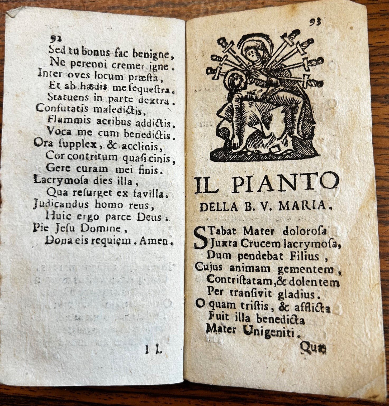 >in- 24 oblungo (mm 140x55), pp 96, cartonato rustico. Grande incisione su legno a piena pagina raffigurante la caduta degli angeli, numerosi frontalini e finalini . Deliziosa edizione di formato inusuale, comprende "offerte" per tutti i giorni della settimana, Sequenza de' morti, Pianto della B.V. Segala o Alessio da Salò (Salò 1558-1628) a 14 anni vestì l'abito talare, fu devotissimo della Madonna, dei Santi e delle anime del Purgatorio, devozione che diffuse creando a Brescia la Confraternita del Suffragio. Autore di numerose opere ascetiche pubblicate in Italia e tradotte in francese e tedesco. Bell'esemplare, qualche piccola marginale macchietta, edizione non comune.