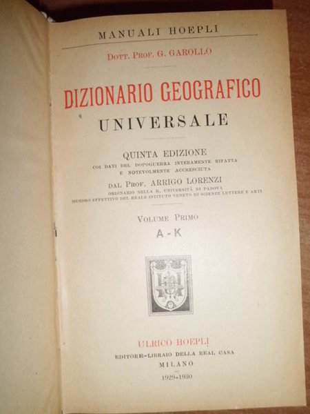 DOTT. PROF. G. GAROLLO. QUINTA EDIZIONE COI DATI DEL DOPOGUERRA INTERAMENTE RIFATTA E NOTEVOLMENTE ACCRESCIUTA DAL PROF. ARRIGO LORENZI. MILANO, ULRICO HOEPLI, 1929 - 1932. 2 VOLUMI IN - 16°, M.TELA, COMPLESSIVE 2191 PP. IN OTTIMO STATO DI CONSERVAZIONE.