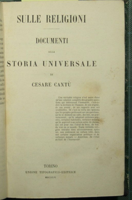 Ottava edizione torinese riveduta dall'autore - in 16° - pp.600; 788; 742; 488; 986; 678; 488; 590; 1154; 347 - Mezza pelle con titolo e fregi in oro al dorso - Dieci volumi - Illustrazioni in b/n al vol. VI - Timbro all'occhiello di ciascun vol. - Vol. I: Sulle religioni; Vol. II: Sulla filosofia; Vol. III: Legislazione e diplomazia; Vol. IV: Sulla guerra; Vol. V: Della letteratura; Vol. VI: Dei monumenti di archeologia e belle arti; Vol. VII: Cronologia; Vol. VIII: Geografia politica; Vol. IX: Biografie; Vol. X: Indici