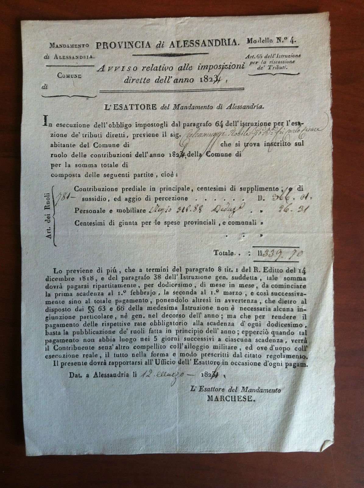 Documento originale del 1823 Provincia di Alessandria Imposizioni Dirette E15934