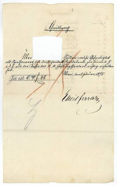 1 S. Folio. Quittung über 48 Gulden "welche Gefertigter als Spielhonorar für umstehende 16 Spielabende pro Jänner d. J. à 3 f aus der Kasse des k. k. Hofburgtheaters richtig erhalten hat […]". Mit dem Verzeichnis der Aufführungen auf der Verso-Seite. - Beschnitten. Mit Kassa- und Registraturvermerken in Buntstift.