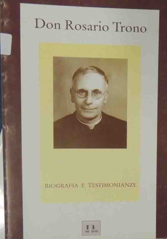 Don Rosario Trono, a cura di Corrado Galignano et al., Edizioni Non Tacere, Copertino (Lecce) 1994, pp. 122, 16 c. di tavv. f.t. ill. b.n., cm 24, br. ed. In copertina: Biografie e testimonianze. Pubblicazione a cura di: Corrado Galignano, Luigi marcelli, Bruno Mazzotta, Cosimo Trono. Piccola etichetta adesiva al dorso, per il resto ben conservato.