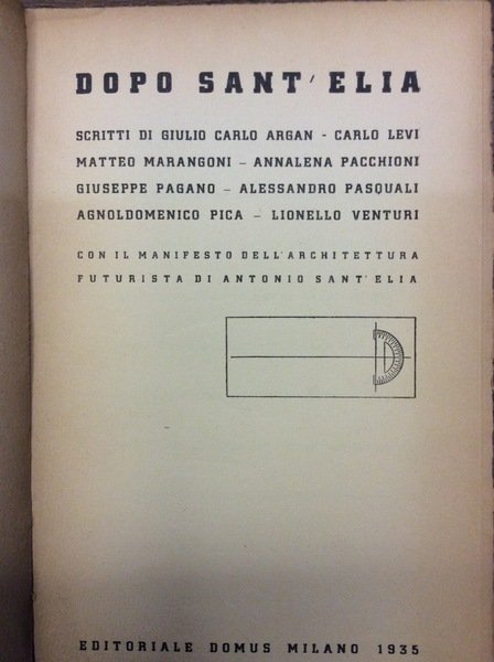 DOPO SANT'ELIA. - Scritti di Giulio Carlo Argan - Carlo Levi - Matteo Marangoni - Annalena Pacchioni - Giuseppe Pagano - Alessandro Pasquali - Agnoldomenico Pica - Lionello Venturi. Con il Manifesto dell'Architettura Futurista di Antonio Sant'Elia.