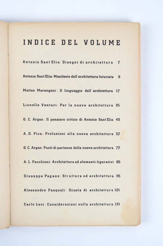 LIBROPrima edizione. Eccellente esemplare, dritto e squadrato, parzialmente a fogli chiusi: raro così.Seminale antologia di scritti sull’architettura e l’arte, alcuni già apparsi sulle colonne di «Domus». Fu un libro/manifesto per la generazione che si affacciava alla maturità in quel periodo (come per esempio Bruno Zevi: Dulio, Introduzione a Bruno Zevi, § 1), e una fondamentale affermazione del moderno in campo architettonico e artistico. Pregevole e raffinata impaginazione razionalista curata dai grafici di «Domus» e dal tipografo Modiano.