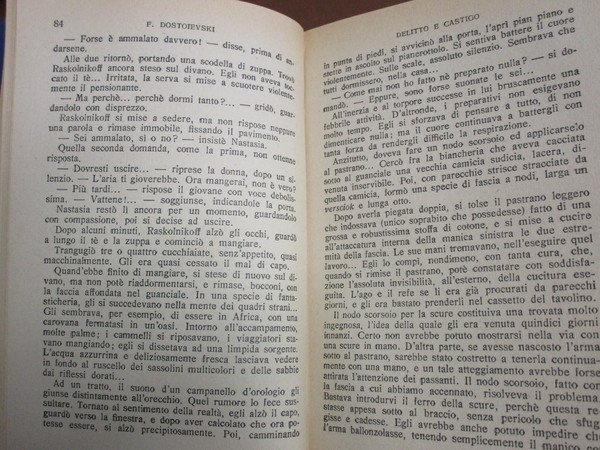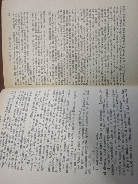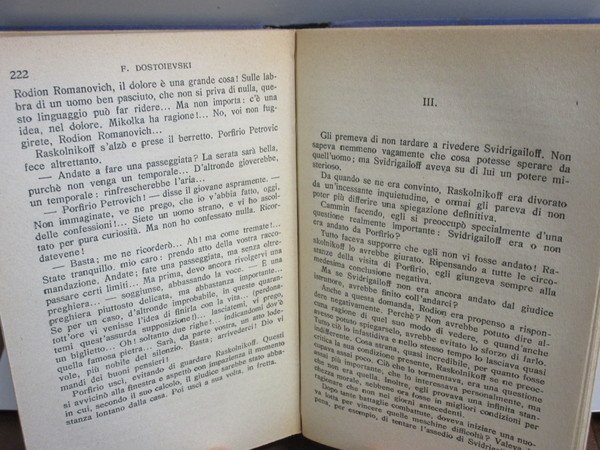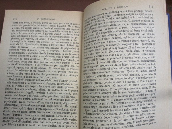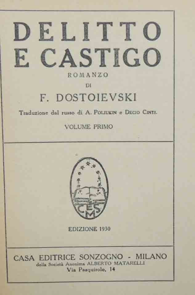Fedor Dostoievski, Delitto e castigo. Romanzo, traduzione dal russo di A. Poliukin e Decio Cinti, Casa Editrice Sonzogno, Milano 1930, 2 voll. pp. 628, cm 18, legatura in tutta tela ed. con titoli al dorso e al piatto. Collana I grandi autori, nn. 11 e 12. Leggere tracce d’uso, minime fioriture ai tagli, carta lievemente brunita, per il resto ben conservati.