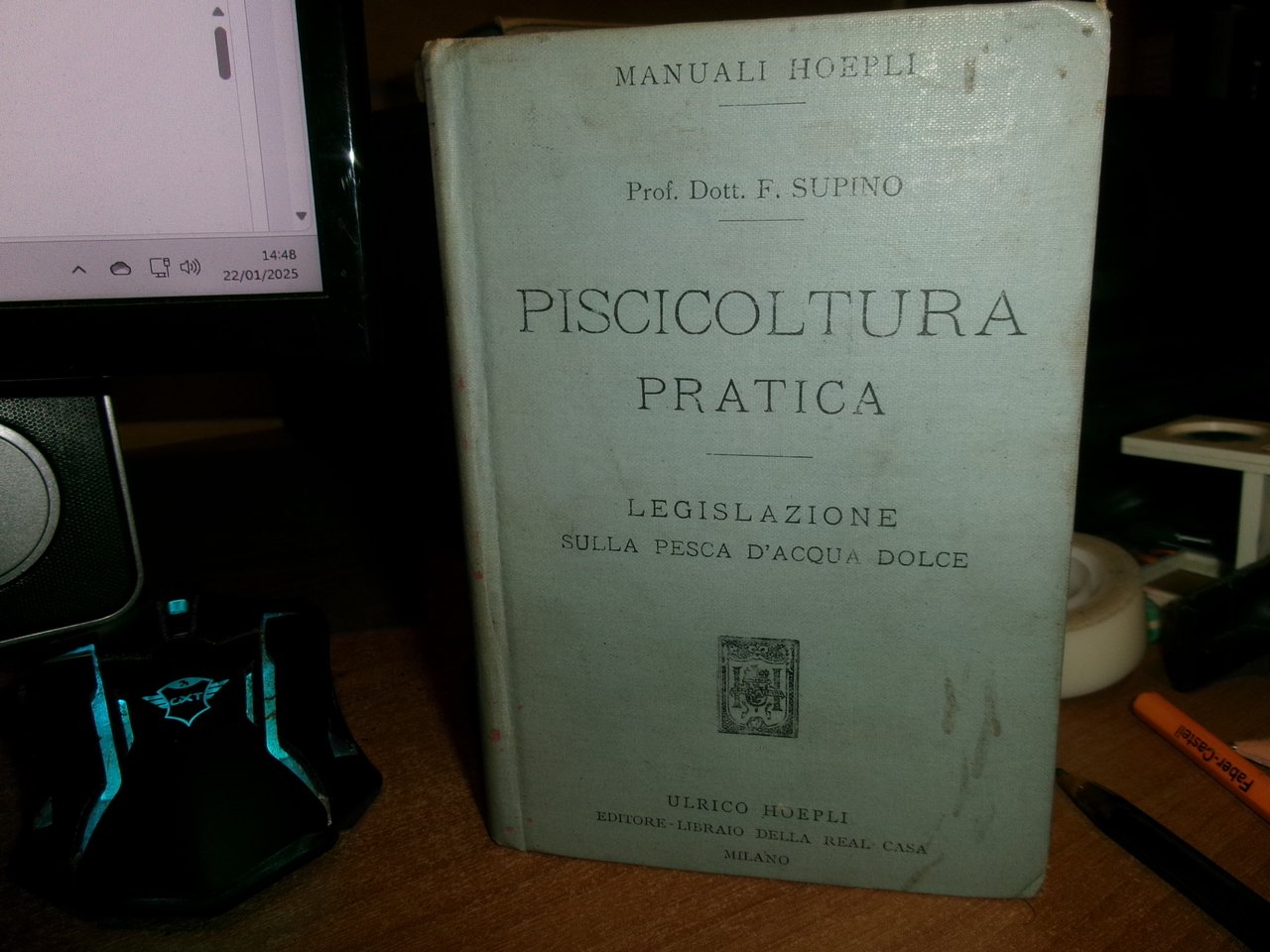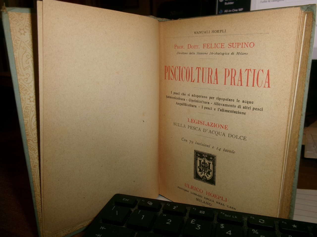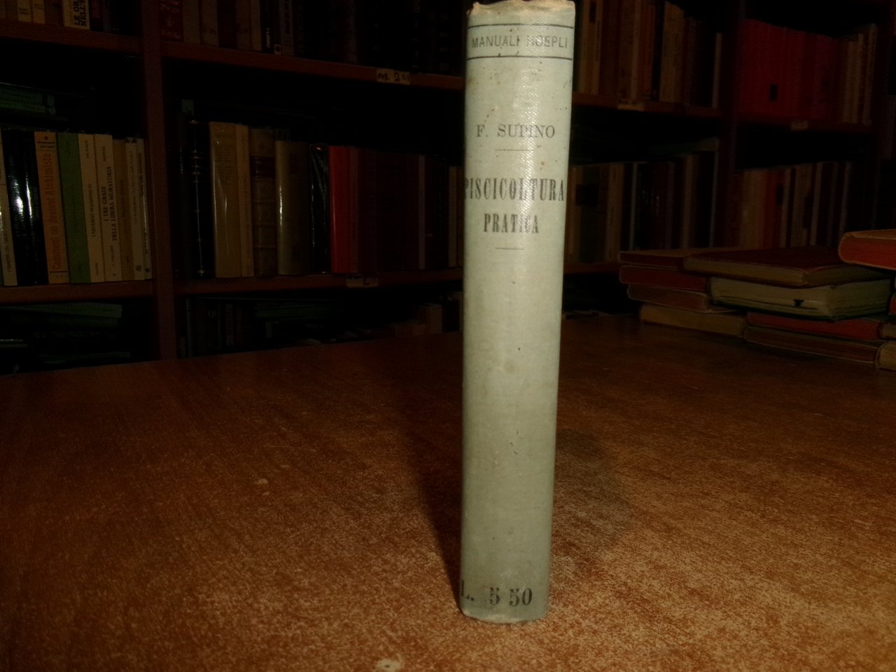 Dott. FELICE SUPINO. PISCICOLTURA PRATICA Legislazione sulla Pesca d' acqua dolce. I Pesci che si adoperano per ripopolare le acque Salmonicoltura - Ciprinicoltura - Allevamento di altri pesci - Anguillicoltura - I pesci e l' alimentazione. Milano, Ulrico Hoepli 1917. In-16°, tela edit. viii, 327 pp. con 79 incisioni e 14 tavole. Lieve segno del tempo sul piano anteriore ma libro in ottimo stato di conservazione. Neg. Hoepli mob. 19