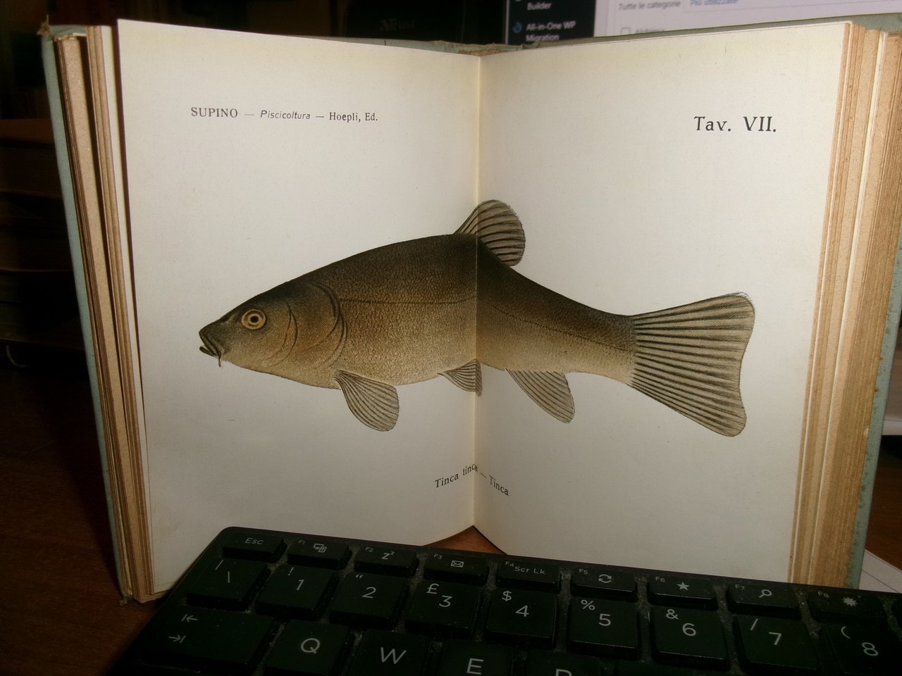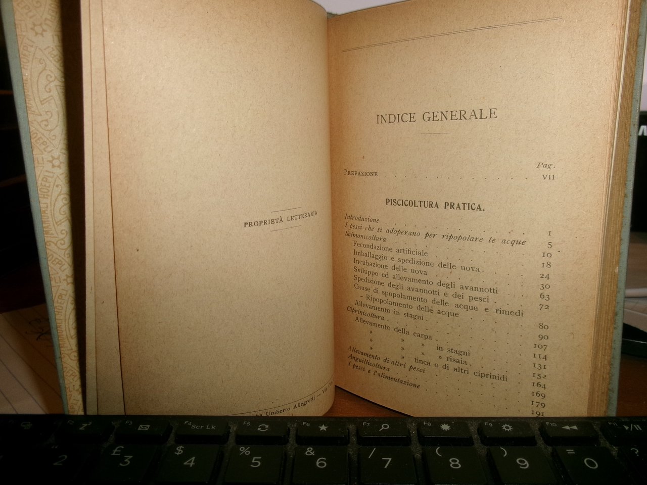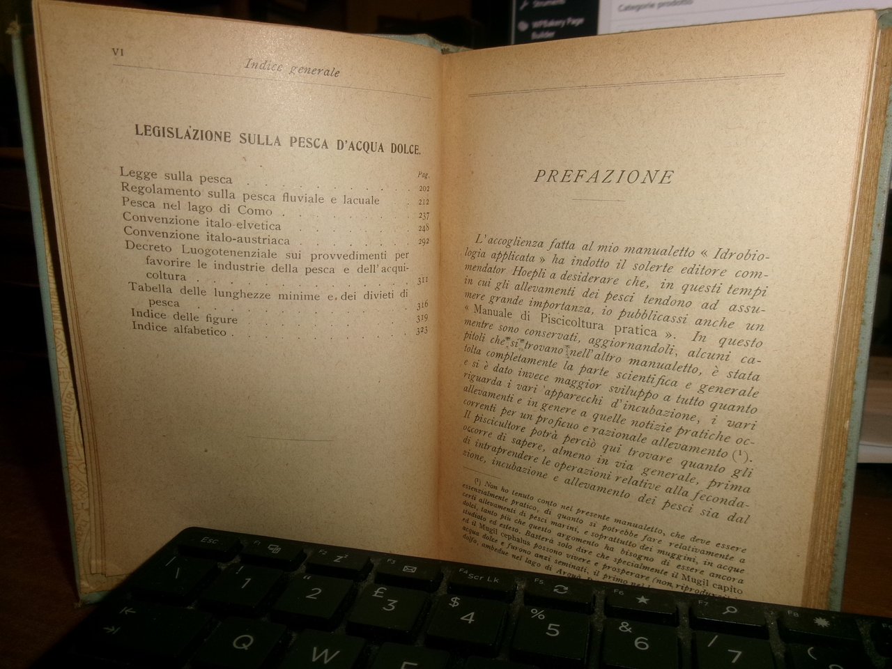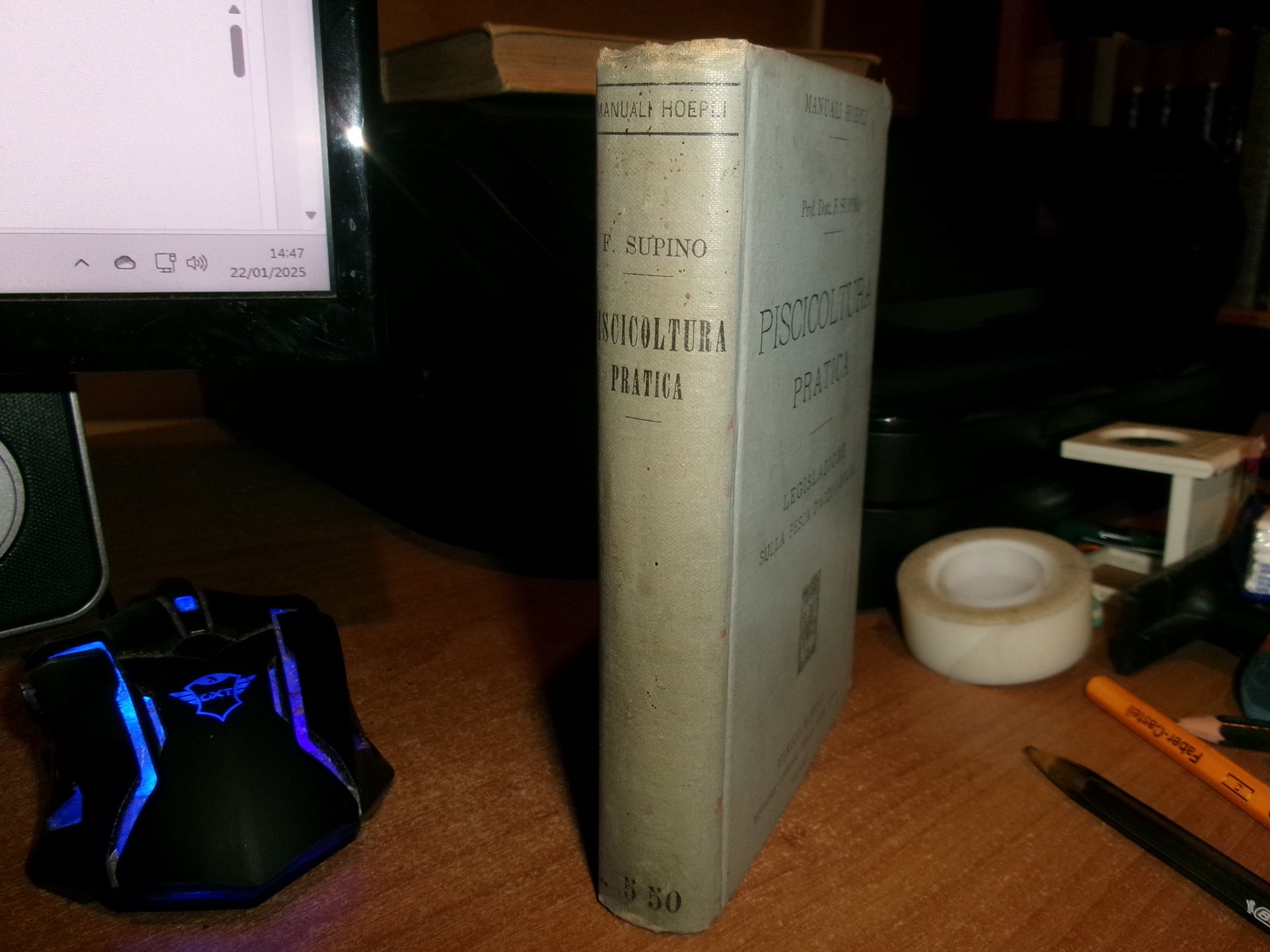 Dott. FELICE SUPINO. PISCICOLTURA PRATICA Legislazione sulla Pesca d' acqua dolce. I Pesci che si adoperano per ripopolare le acque Salmonicoltura - Ciprinicoltura - Allevamento di altri pesci - Anguillicoltura - I pesci e l' alimentazione. Milano, Ulrico Hoepli 1917. In-16°, tela edit. viii, 327 pp. con 79 incisioni e 14 tavole. Lieve segno del tempo sul piano anteriore ma libro in ottimo stato di conservazione. Neg. Hoepli mob. 19