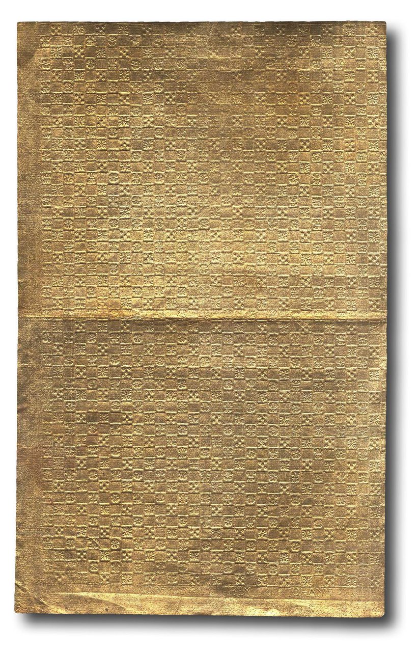 >2 fogli ciascuno (mm 202x326), stampa dorata e goffrata su carta dorata; alternanza di superfici dorate incavate e superfici non dorate rilevate. Il primo presenta piccoli tralci arcuati con fiori e frutti sempre diversi: melograni, garofani, grappoli d'uva, palmette, campanule. Il secondo un motivo geometrico a piccoli quadrati entro cui sono inseriti alternate tre diverse tipologie floreali. In basso è presente la scritta in capitali "Augusburg Bey Iohann". Il laboratorio di Munck ha svolto l'attività fra il 1750 e il 1794. Tracce di antica piegatura.
