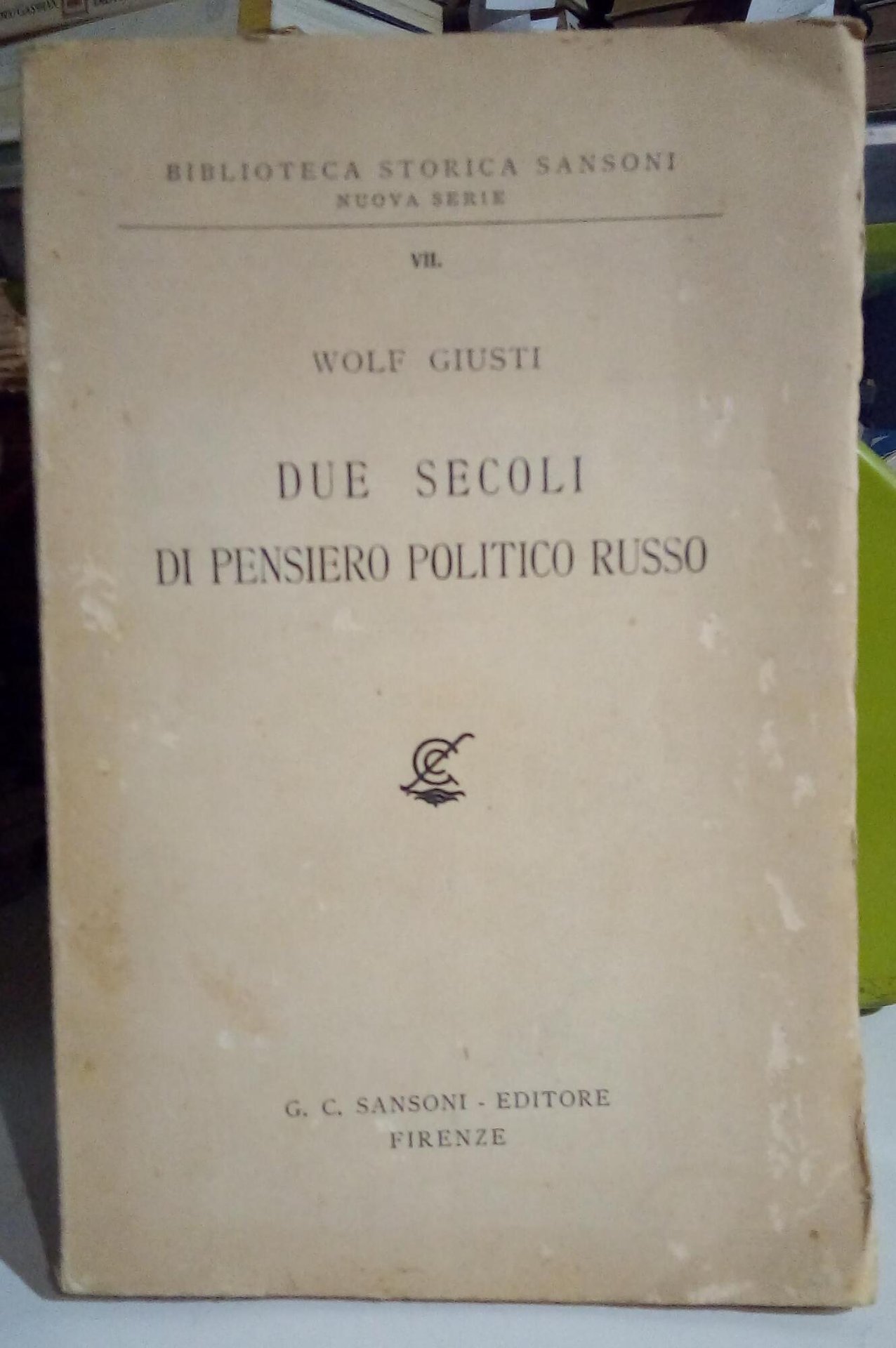 Copertina cartonata ombrata lievemente e ingiallita, con abrasioni, ma non gravi. Tagli e pagine ingialliti. Bordi stanchi. Collana: "Biblioteca storica Sansoni nuova serie vol. VII". Rare sottolineature in matita. flessibile 342 Buono (Good) .