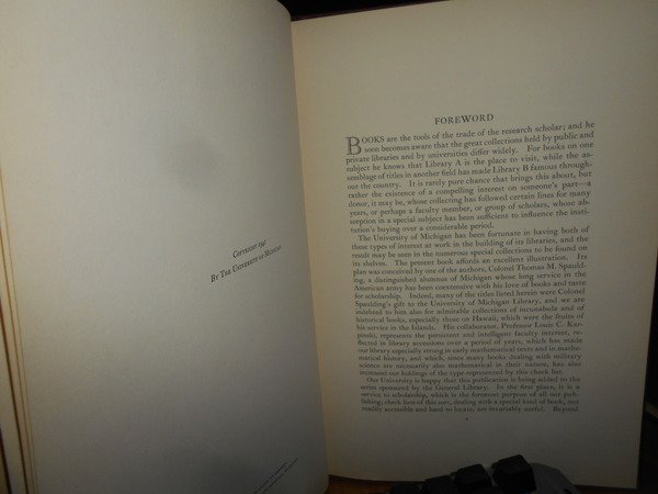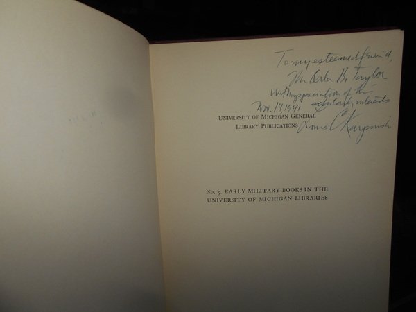By Thomas M. Spaulding and Louis C. Karpinski. The University of Michigan Press, Ann Arbor, 1941. Early Military Books in the University of Michigan Libraries. In-8° grande, tela bordeaux con titolo in oro al dorso. xvi, 45 pp. con XXXVII tavole fuori testo. Ottimo esemplare con dedica firmata dall' Autore all' occhietto. Uff. B - III - 3