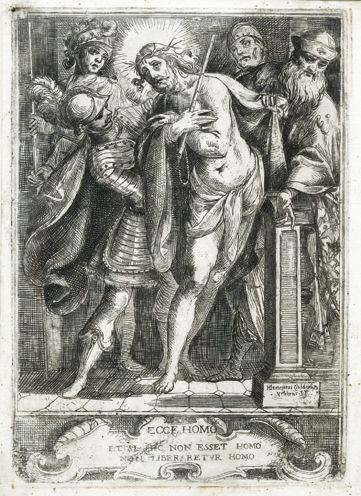 >Bulino originale, (mm 274x194), un cm. di margine sui quattro lati (lieve restauro al verso del margine inferiore) Il titolo indicato appare su un cartiglio in basso della scena; la firma si legge ai piedi di una colonnina: "Hieronimus Cialdierus Urbinum I.F." . Incisione estremamente rara del Cialdieri (Urbino 1593-1680, pittore, incsore, architetto) artista che ha lasciato pochissimi rami. Il Cristo coronato di spine è a figura intera, mostrato al popolo da Caifa e da tre armati. Il Gesù ha figura dolcissima e colma di dolore umano. (Lieve restauro della carta al verso del margine inferiore). Cfr. Thieme-Becker VI, 558. Nagler, Die monogrammisten, I, 2820.