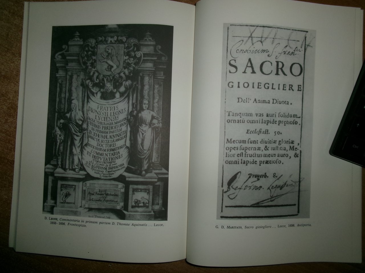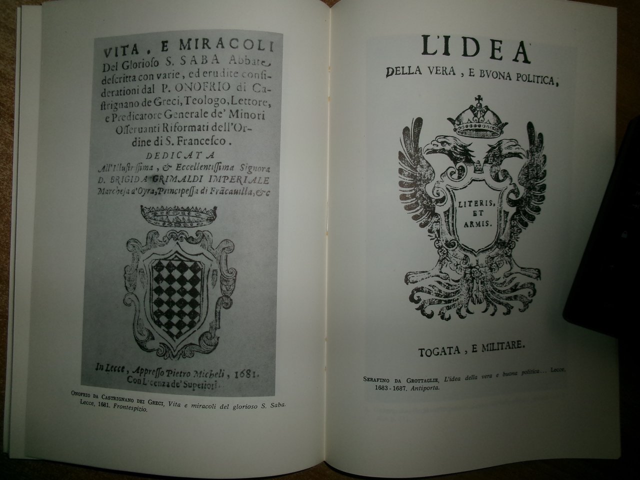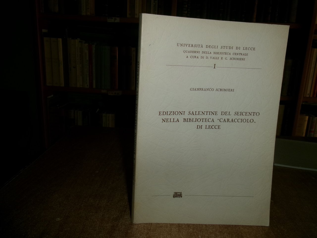 Gianfranco Scrimieri. Lecce, Edi Quattro, 1972. Edizioni salentine del seicento nella Biblioteca Caracciolo di Lecce. In-8°, br. 78 pp. con numerose tavole f.t. (documentazione fotografica). Ottimo stato. Neg. fot. mob. N