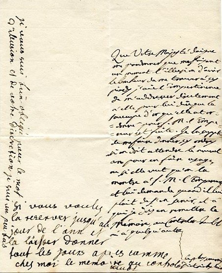 2 S. auf Doppelblatt. 8vo. Sich untertänigst für die Unverfrorenheit entschuldigend, sich direkt an Seine Majestät zu wenden, setzt Dietrichstein Maria Theresia davon in Kenntnis, daß die goldene Untertasse, die sie für Seine Majestät den Kaiser geordert habe, nun fertig sei. Er möchte nun wissen, ob man das neue Jahr abwarten solle oder ob sie wünsche, daß man die Untertasse Seiner Majestät dem Kaiser zeige und frage, wann es ihm genehm sei, sich ihrer zu bedienen. Des weiteren wünsche er zu erfahren, an wen er die Rechnung schicken solle: "[…] j'ai l'impertinence de m'adresser directement à elle pour lui dire que la soucoupe d'or qu'elle at [?] ordonné [!] pour S. M. l'Empereur est faite. Je la supplie de me faire donner ses ordres [?] si on doit attendre le nouvel an pour en faire usage ou si elle veut qu'on la montre à S. M. l'Empereur et lui demande quand il lui plait [!] de s'en servir et à qui je dois remettre la mémoire […]". Maria Theresia nun ersucht Dietrichstein, die Tasse bis zum Neujahrstag aufzubewahren und sie hernach an einem beliebigen Tag zu übergeben.