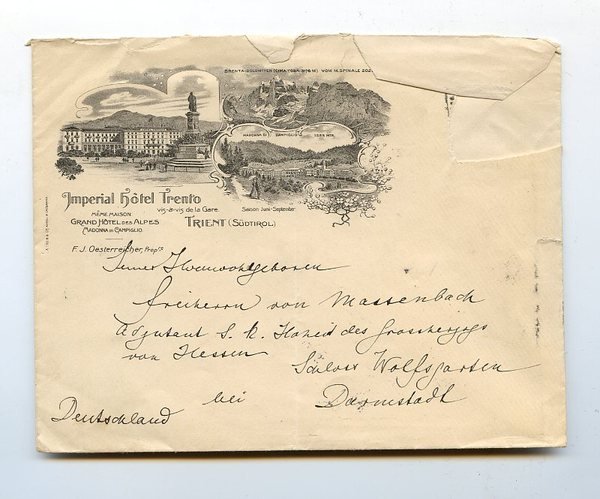 1 S. Qu.-8vo. An den Freiherrn von Massenbach, Adjutant S. K. Hoheit des Großherzogs von Hessen. - Auf Briefpapier mit lithogr. Briefkopf des Hotel Imperial in Trient; die Briefmarke von alter Hand ausgeschnitten.